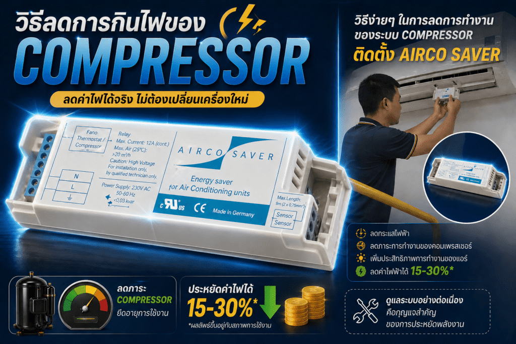 AIRCO SAVER อุปกรณ์ประหยัดไฟฟ้าสำหรับเครื่องปรับอากาศ ที่มีความสามารถในการควบคุมการทำงานของระบบ Compressor Air ให้ลดการทำงานที่เกินความจำเป็นในการทำความเย็นออกจากตัวระบบ ส่งผลให้แอร์ทำงานเต็มประสิทธิภาพ โดยไม่เกิดการสูญเสียพลังงานโดยไม่จำเป็น