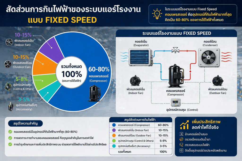 • Compressor ใช้ไฟ 60–80% ของทั้งเครื่อง