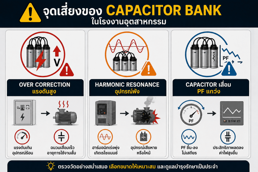 การที่จะปรับปรุงค่า Power Factor จำเป็นที่ผู้ดำเนินการ อย่างวิศวกรจำเป็นต้องมีความชำนาญและมีประสบการณ์ในการปรับปรุง ถึงแม้ว่าการเปลี่ยน Capacitor Bank จะไม่ใช่เรื่องที่ยากและซับซ้อน แต่หากการปรับปรุงกระทำโดยความไม่เข้าใจก็อาจจะทำให้เกิดปัญหาข้างเคียงตามมาได้ ทำให้เกิดผลเสียกับระบบภาพรวม อาทิ การเกิดฮาร์โมนิกส์ ส่งผลให้ค่า Power Factor มีค่าต่ำลง หรือแม้แต่การเกิดเรโซแนนท์ในระบบได้