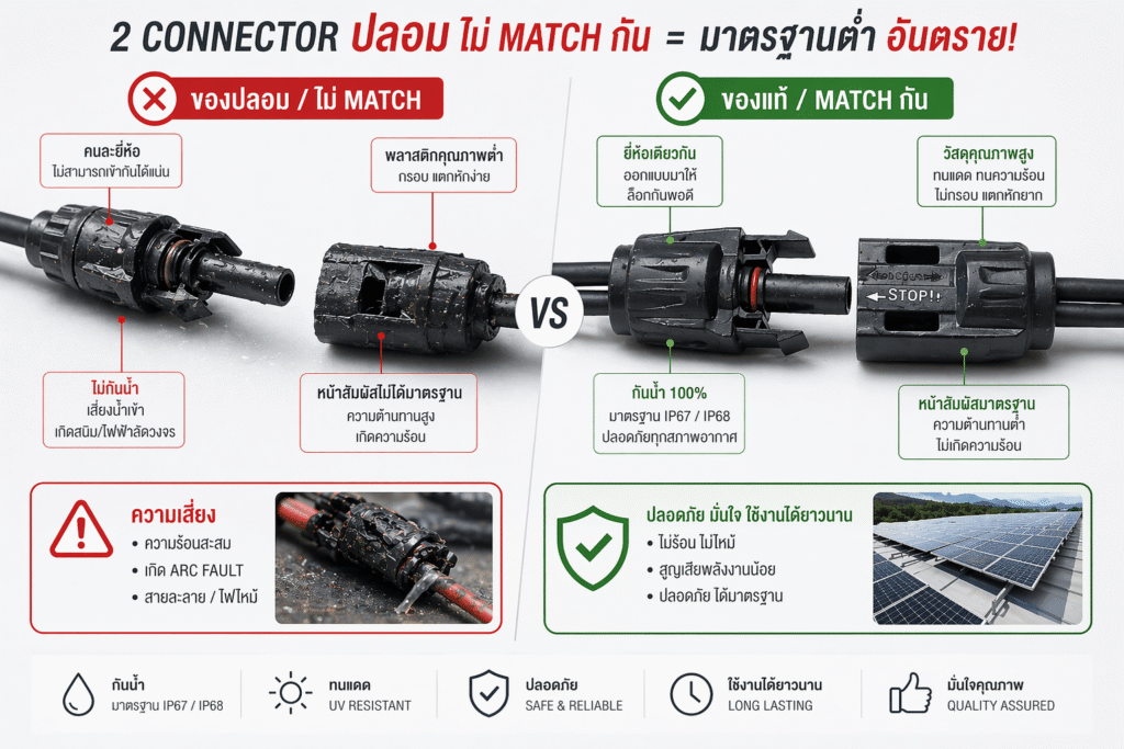 ❗ ปัญหา คือ ใช้ Connector คนละยี่ห้อ หรือของปลอม / คุณภาพต่ำ ⚠️ มีความเสี่ยงระบบความต้านทานสูง เกิดความร้อน นำไปสู่ Arc fault → ไฟไหม้