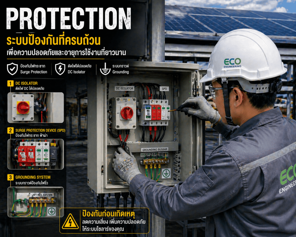 ❗ ปัญหา คือ ลดต้นทุน → ไม่ใส่อุปกรณ์ป้องกัน⚠️ ความเสี่ยง ฟ้าผ่า → inverter พัง และไฟกระชาก → ระบบเสียหาย