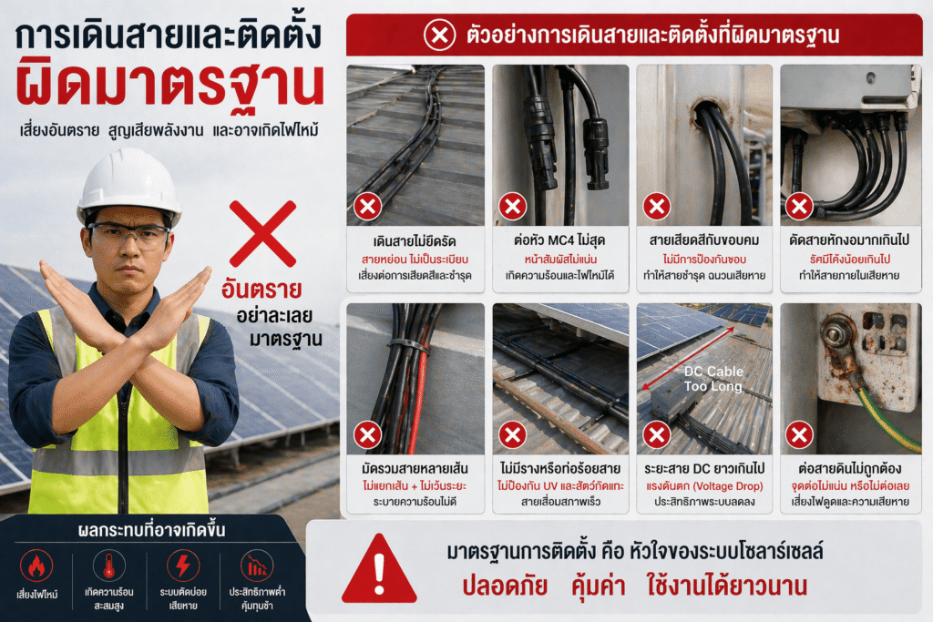 ❗ ปัญหา ใช้สายเล็กกว่าสเปค หรือเดินสายผิดมาตรฐาน⚠️ ความเสี่ยง Voltage drop , สูญเสียพลังงาน , ฉนวนเสื่อมเร็ว
